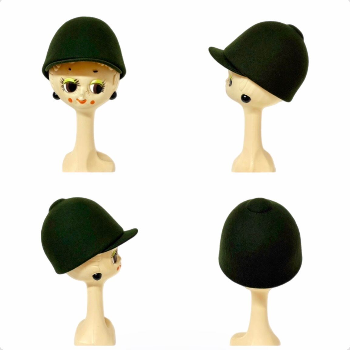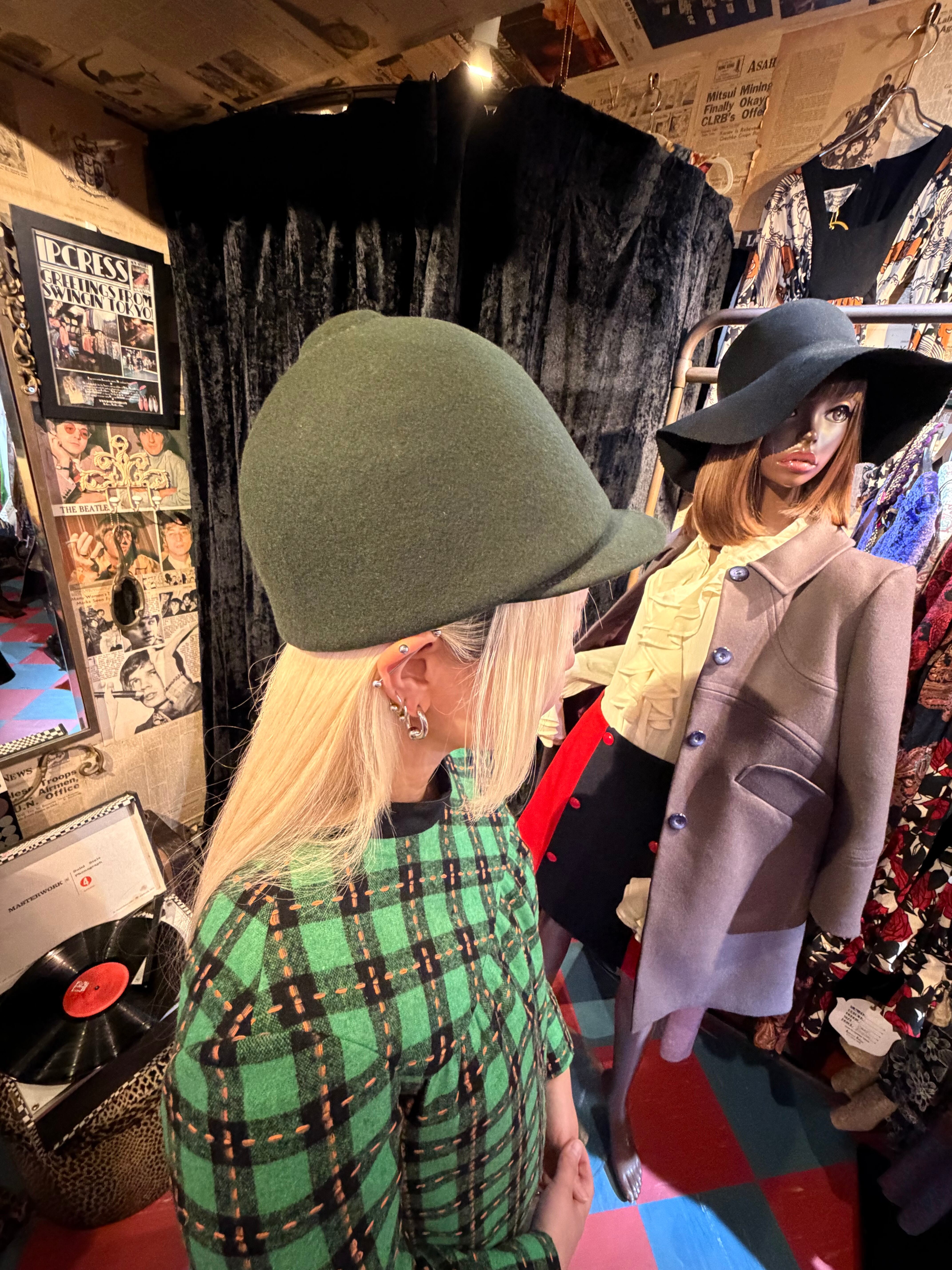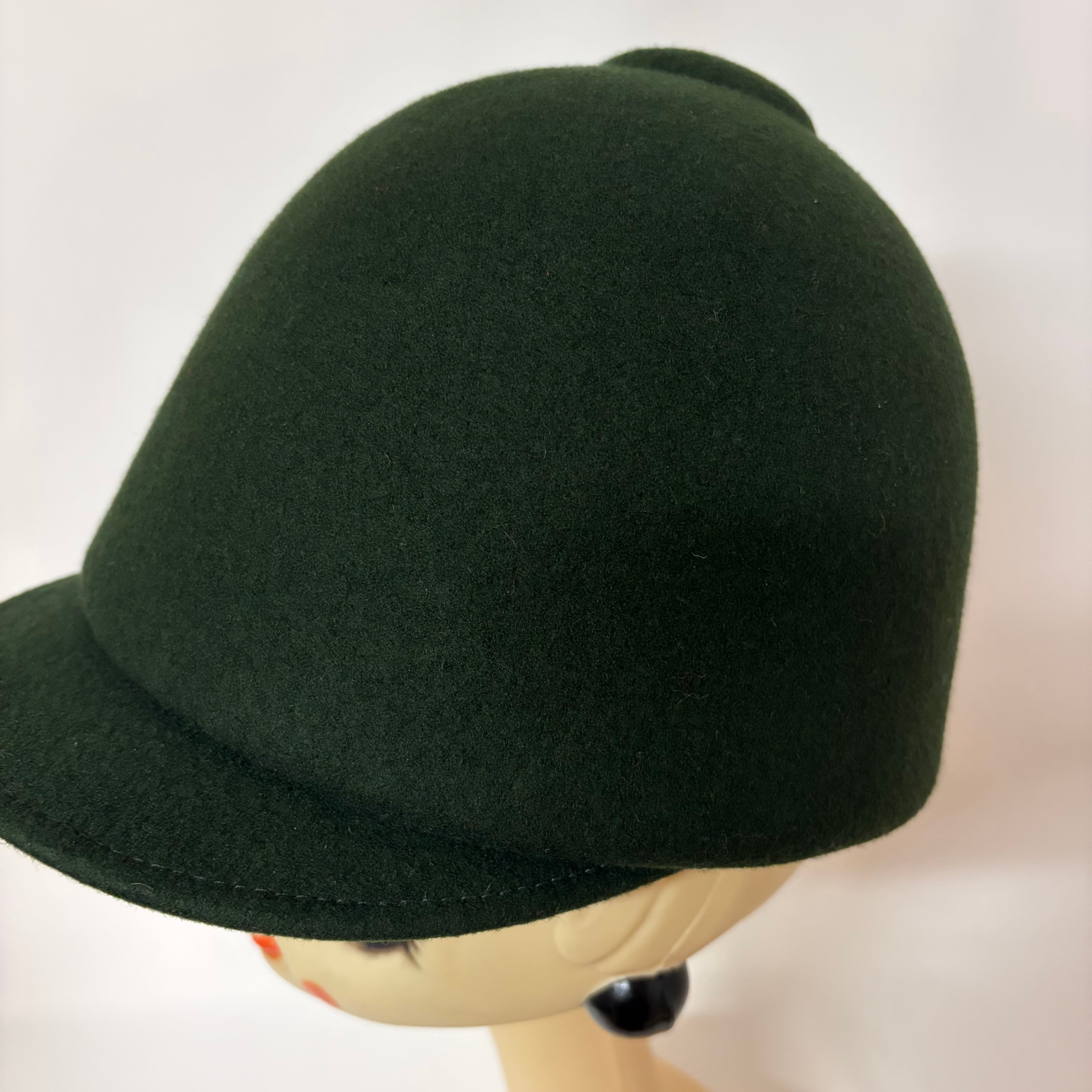 乗馬のときに被るジョッキーハットのようなシルエットの帽子。
