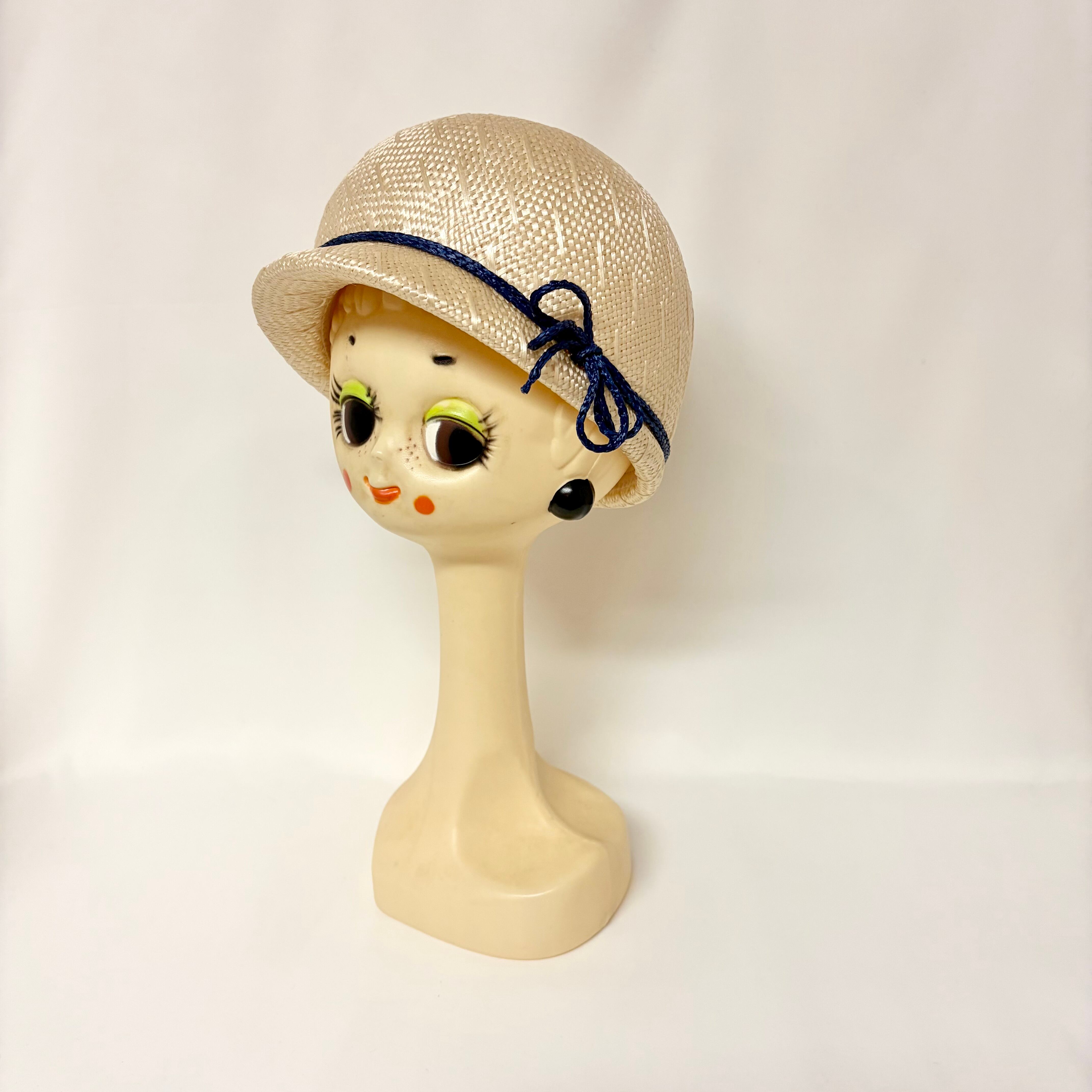 編み柄の入ったオフホワイトのストローに、ネイビーのコード飾りが夏らしい一点です。