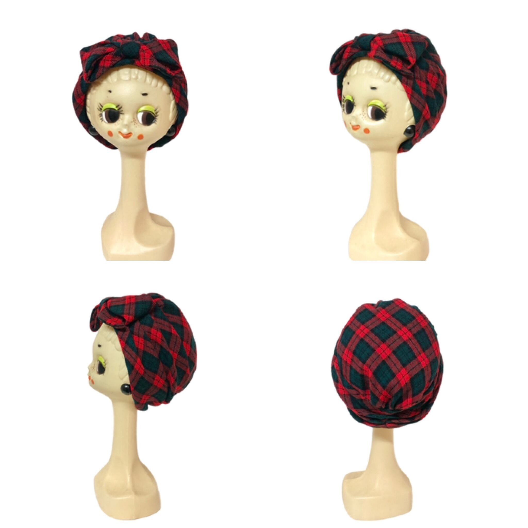 赤いタータンチェックが可愛いターバンハット。柔らかいウールです。