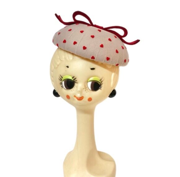 フロッキーの赤いハートが散りばめられたチュールを覆ったプチベレーに、大きめのフェルトリボンを飾ったとびきりキュートでラブリーな一点です❤️